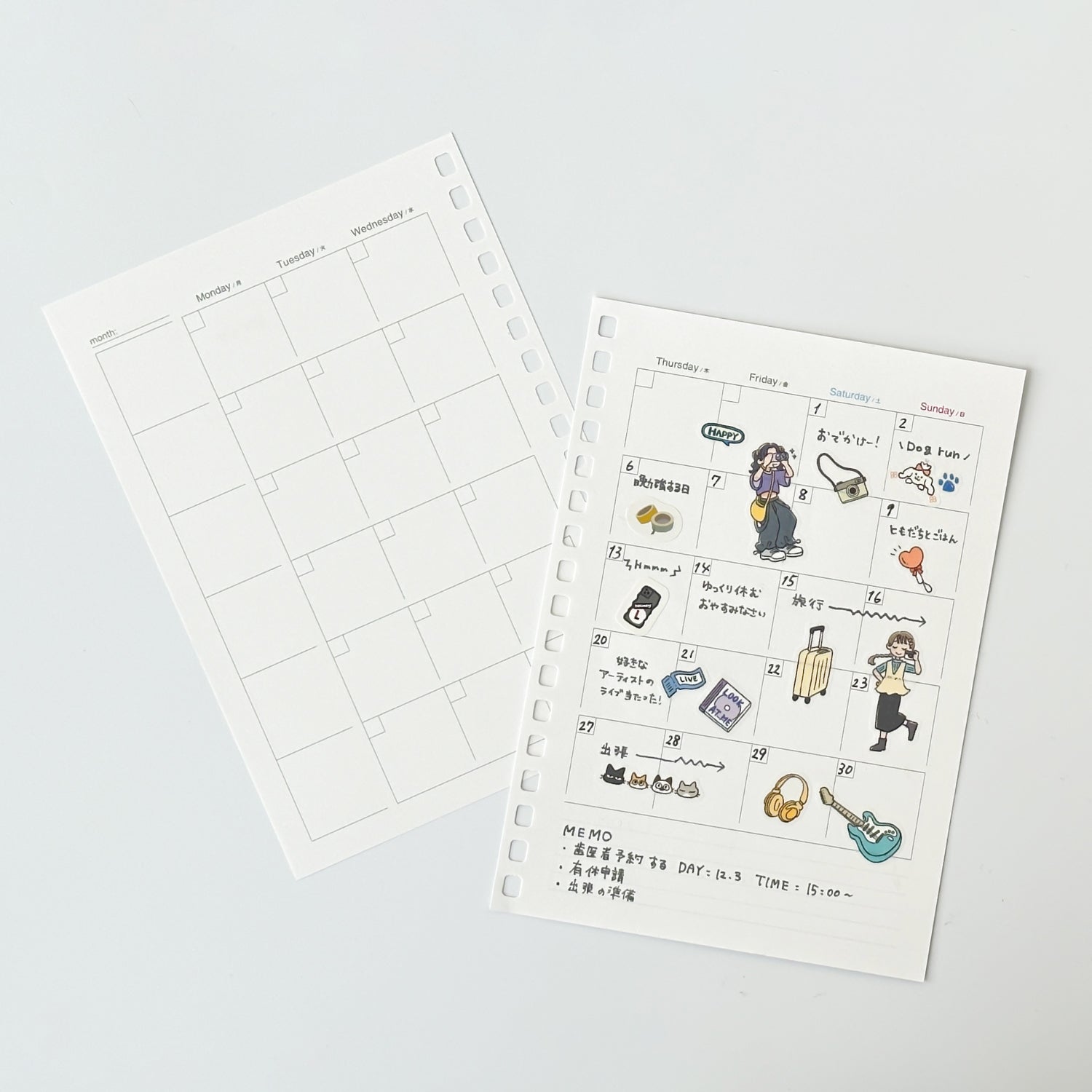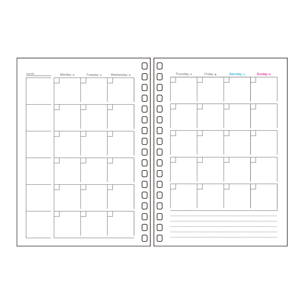 自分で日付を書き込んで、いつからでも使い始められる日付フリータイプのマンスリーリーフです。